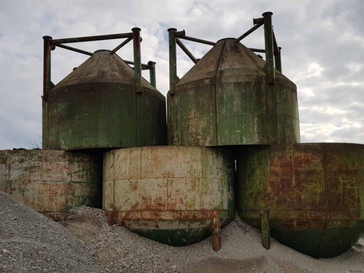 5 Stück Silos (ca. 150 cbm/Silo), geschraubt, auf Stahlfüssen ca. 3 m hoch, Siloshöhe ca. 5 m, Durchmesser ca. 7 m