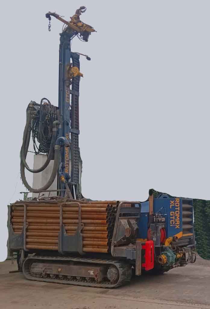 Raupenbohrgerät, Spülbohrgerät, Doppelkopfanlage, Bohrungen mit Schutzverrohrung, Erdwärme bis 250 m Tiefe – Durchmesser bis 180 mm, Brunnenbohren bis 100 m Tiefe – bis 400 mm Durchmesser, Leistung 168 KW, mit 150 m Bohrgestänge (90 mm) und 30 m Schutzverrohrung (178 mm)