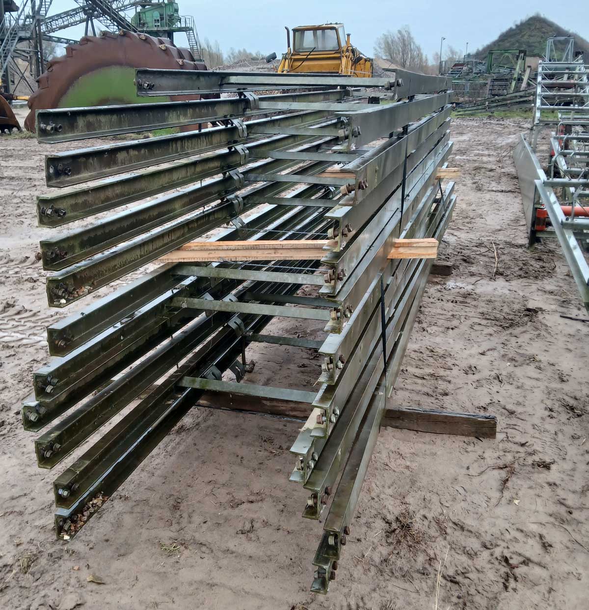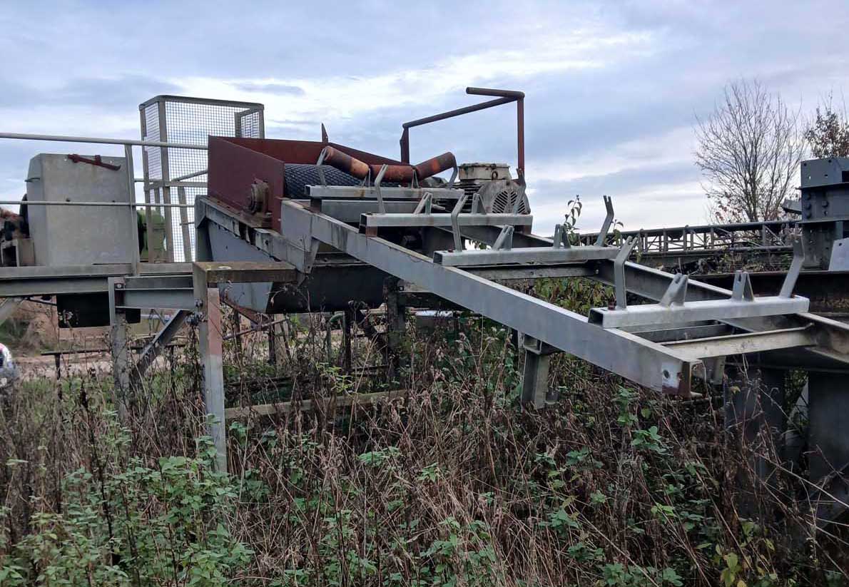 ca. 180m Landbandstraße für 650 mm Gurtbreite bestehend aus 30 Stück Landband Profilstösse, Feuerverzinkt, in Profilhöhen von 120 mm (9 Stk) und 100 mm (21 Stk), 1 Stück Antriebsstation mit Stiebel Aufsteckgetriebe 18,5/22kW mit Übersetzungsverhältnis i=11,6:1 – Trommeldurchmesser 430 mm – Förderbandgeschwindigkeit v= 2,68 m/s, 1 Stück Umkehrstation – Trommeldruchmesser 330mm, 150 Stück Rollenstühle, dreiteilig plus Befestigungsschrauben